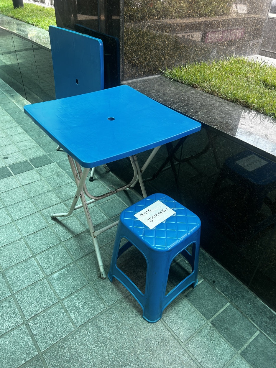 매장 바로 앞에 있는 파란색 접이식 테이블과 의자가 마련되어 있어요.