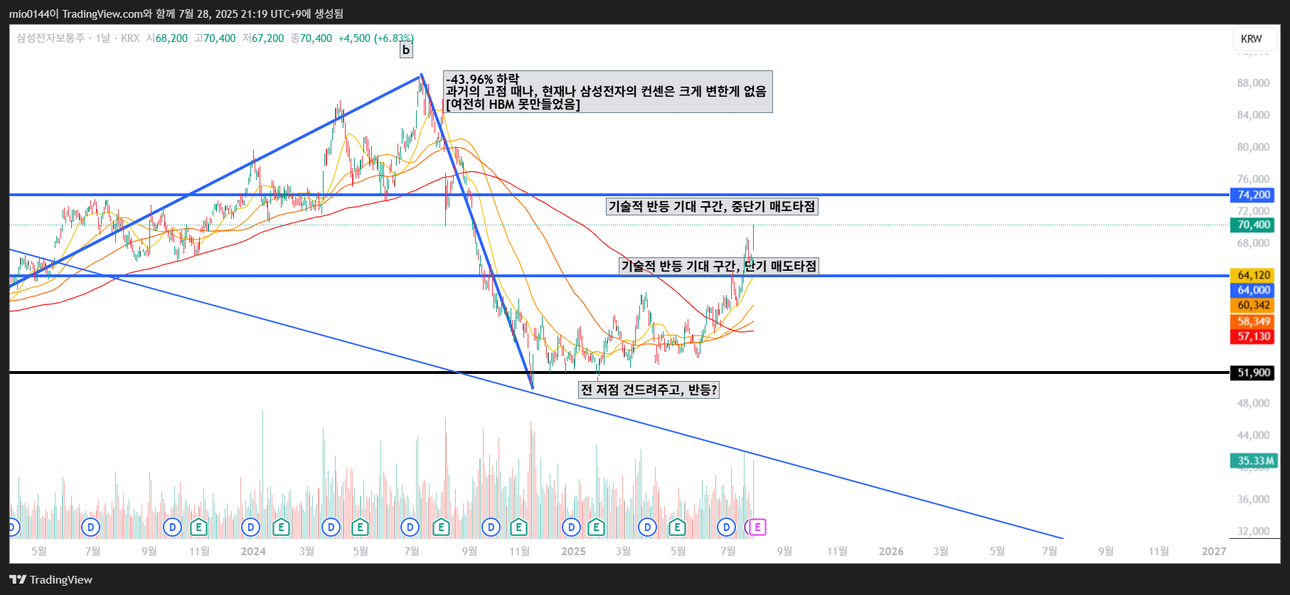 2025년 7월 28일, 삼성전자 주가가 장중 70,400원까지 오르며 6% 넘는 급등세를 보였습니다. 최근 수개월 간 60,000원 초반대에서 박스권에 갇혀 있던 주가 흐름을 생각하면, 오늘의 움직임은 매우 이례적이었죠.