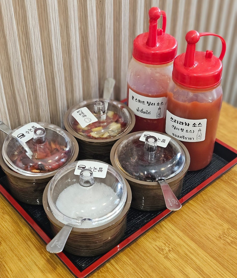 스리라차, 스위트 칠리, 피쉬소스, 설탕, 식초 등