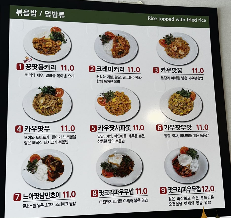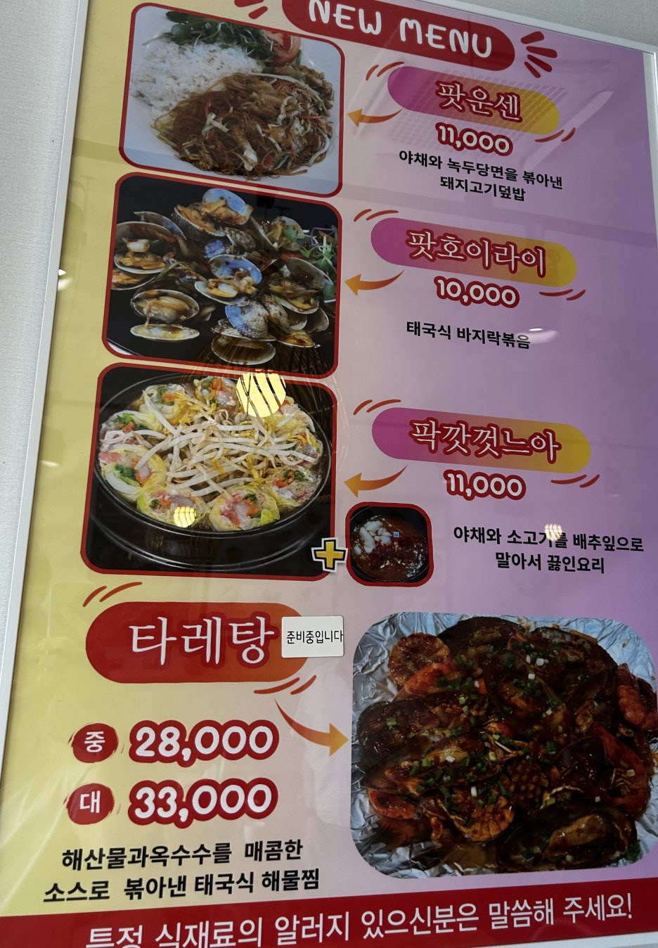 메뉴는 팟타이, 쏨땀, 똠얌꿍, 볶음밥 등